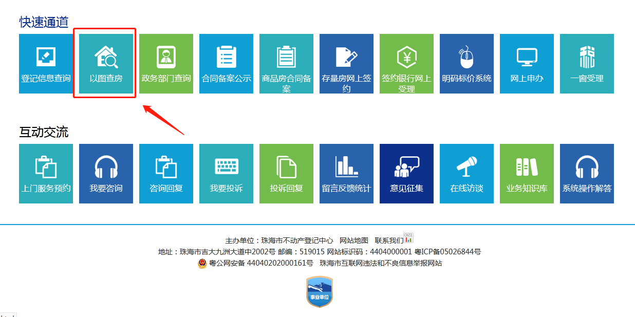 请登录珠海市不动产登记中心网站(http://bdc.zhuhai.gov.cn/),在“快速通道”中选择 “以图查房”。