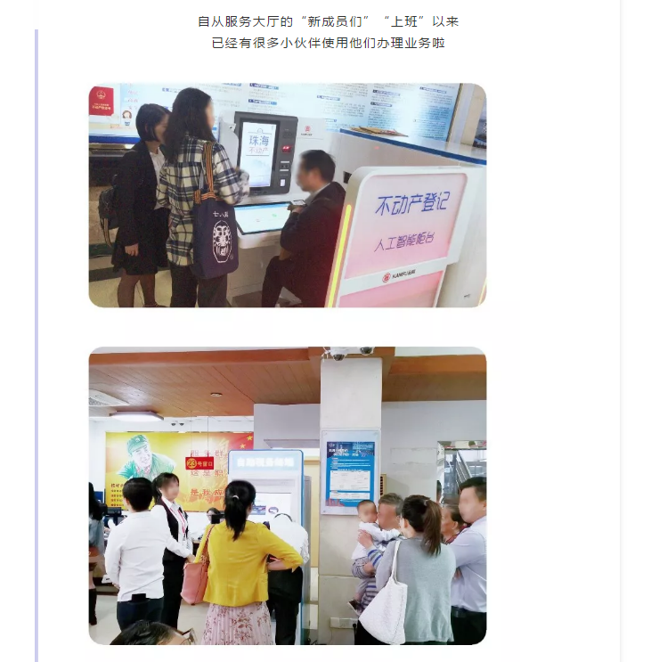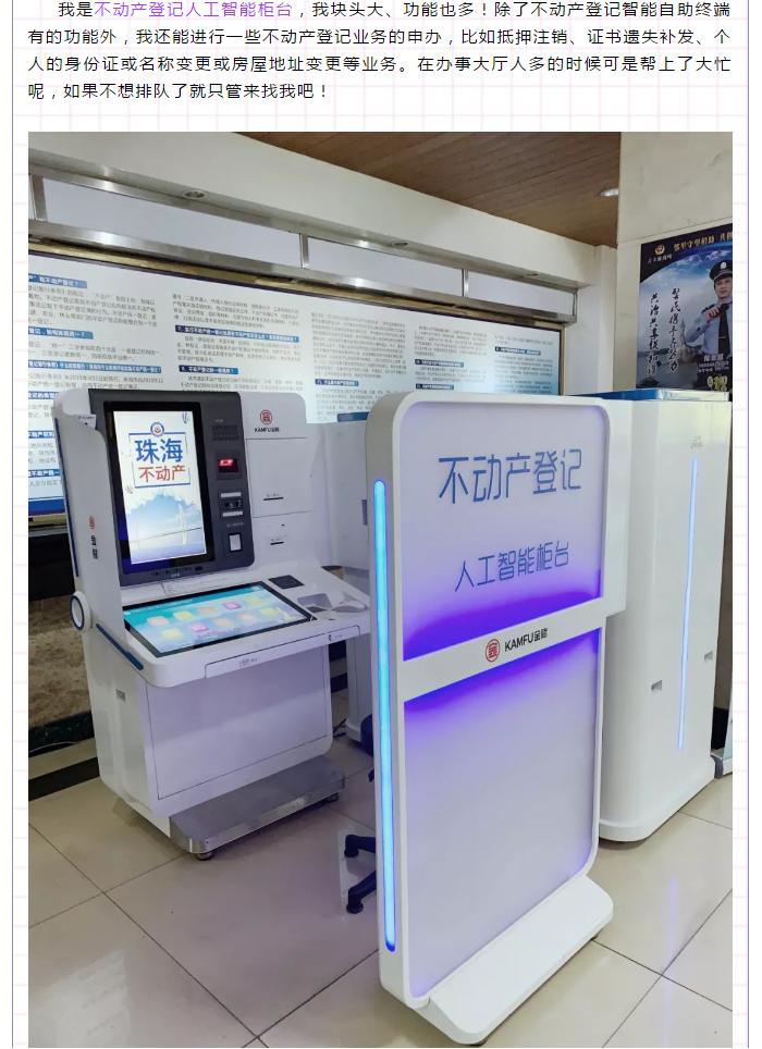 2018年以来,珠海市不动产登记中心全力推进“互联网 不动产登记”工作,以夯实登记数据信息为基础,推动我市不动产登记服务向智能化发展。近来,中心的服务大厅又迎来了多位“新成员”,让他们来做自我介绍吧!