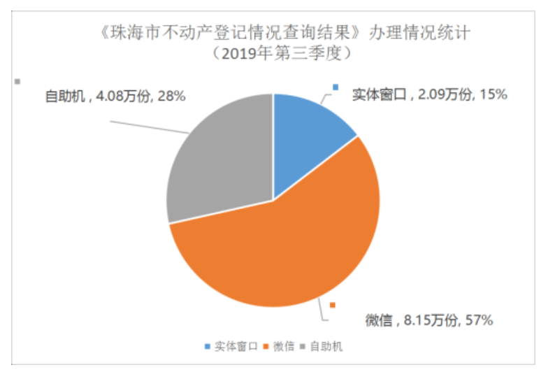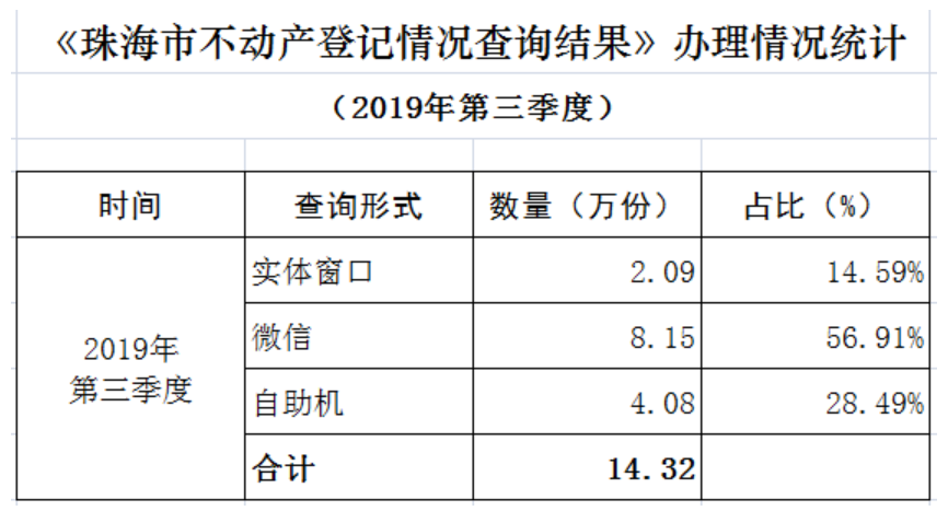 2019年7月至9月,市不动产登记中心出具《珠海市不动产登记情况查询结果》14.32万份,具体如下: