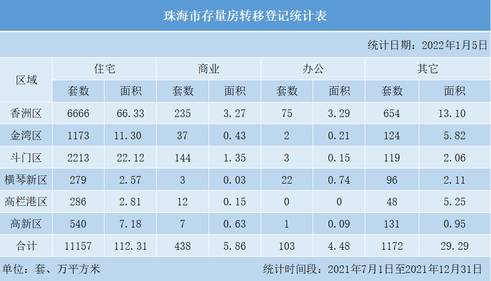 【登记数据】数据:珠海市存量房转移登记统计表(2021年下半年)