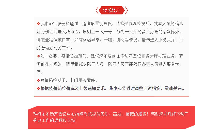 尊敬的办事企业和群众: 为全面贯彻落实党中央国务院坚决打赢疫情防控阻击战的决策部署,进一步加强新型冠状病毒肺炎疫情防控工作,有效减少人员聚集,阻断疫情传播,更好地保障人民群众的生命安全和身体健康,我中心特对节后不动产登记业务的办理方式进行如下调整:
