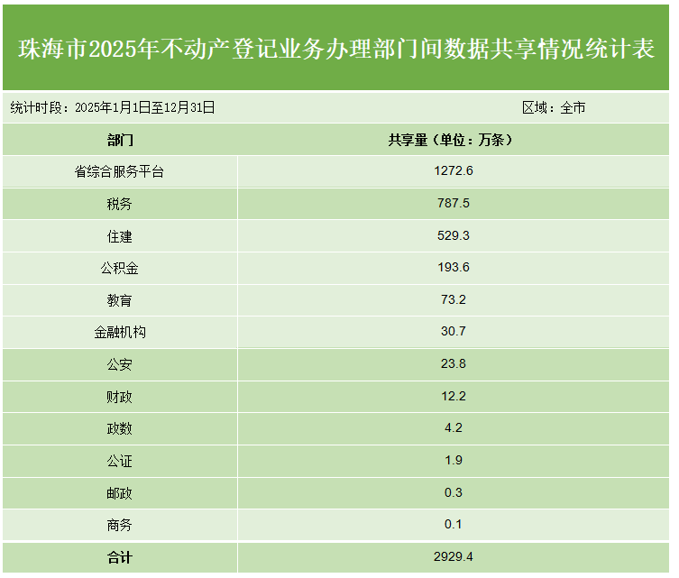 珠海市2025年不动产登记业务办理部门间数据共享情况统计表